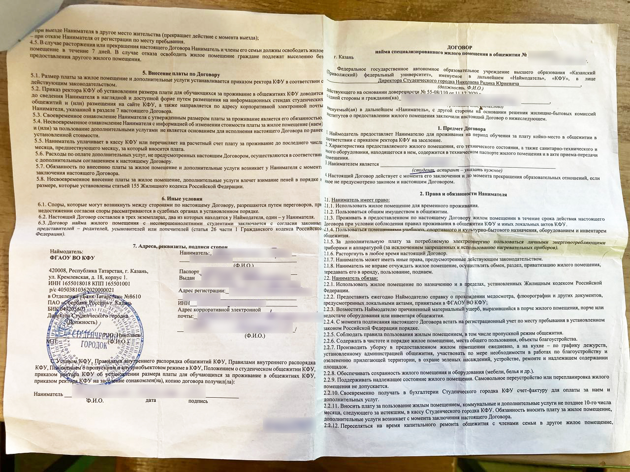 ✅ Обратите внимание на пункт о том, какую комнату и в каком общежитии вам предоставляют. Если номер комнаты не прописан в договоре, будьте готовы к тому, что администрация вуза может переселить вас в любой момент — и это будет вполне законно, ведь в вашем договоре не указана какая именно комната принадлежит вам.