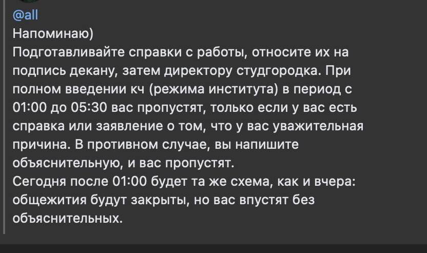 На этом история с общежитиями не заканчивается. С октября 2023 года на территории студенческого городка ввели комендантский час. Прямо его так никто не называл: по словам студентов, ректор МГИКа обозначила такое нововведение как «режим работы студенческого городка». Сами студенты связывают эту ситуацию с коллективным письмом.